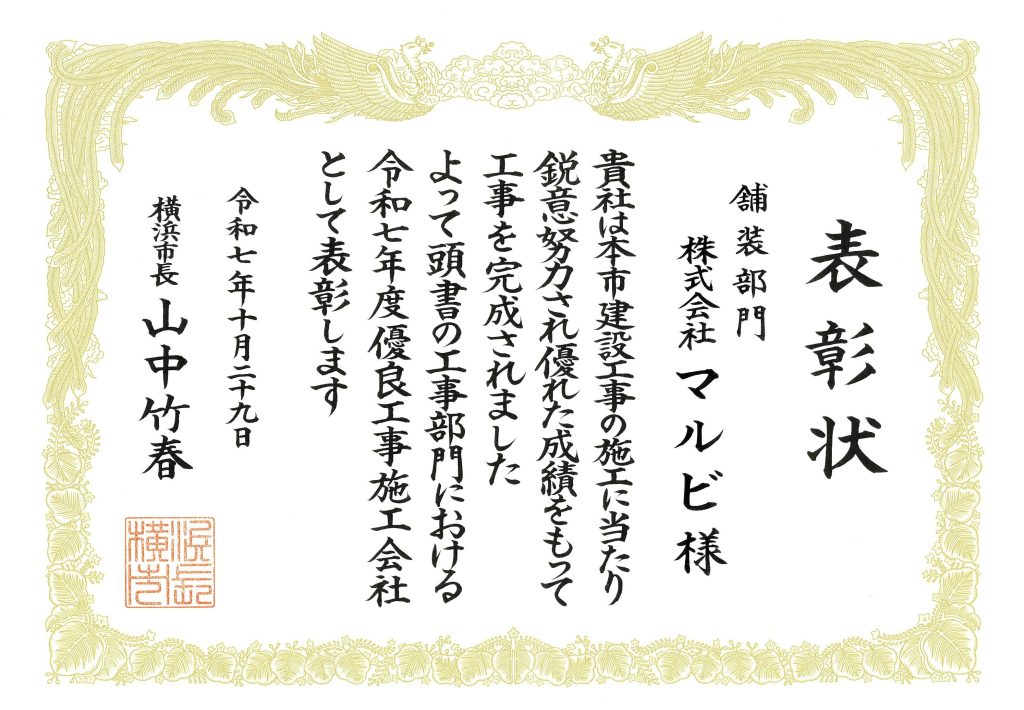 このたび、横浜市様より「令和7年度優良工事施工会社表彰」を受賞いたしました。
