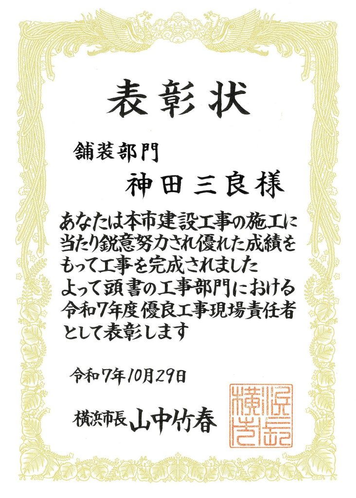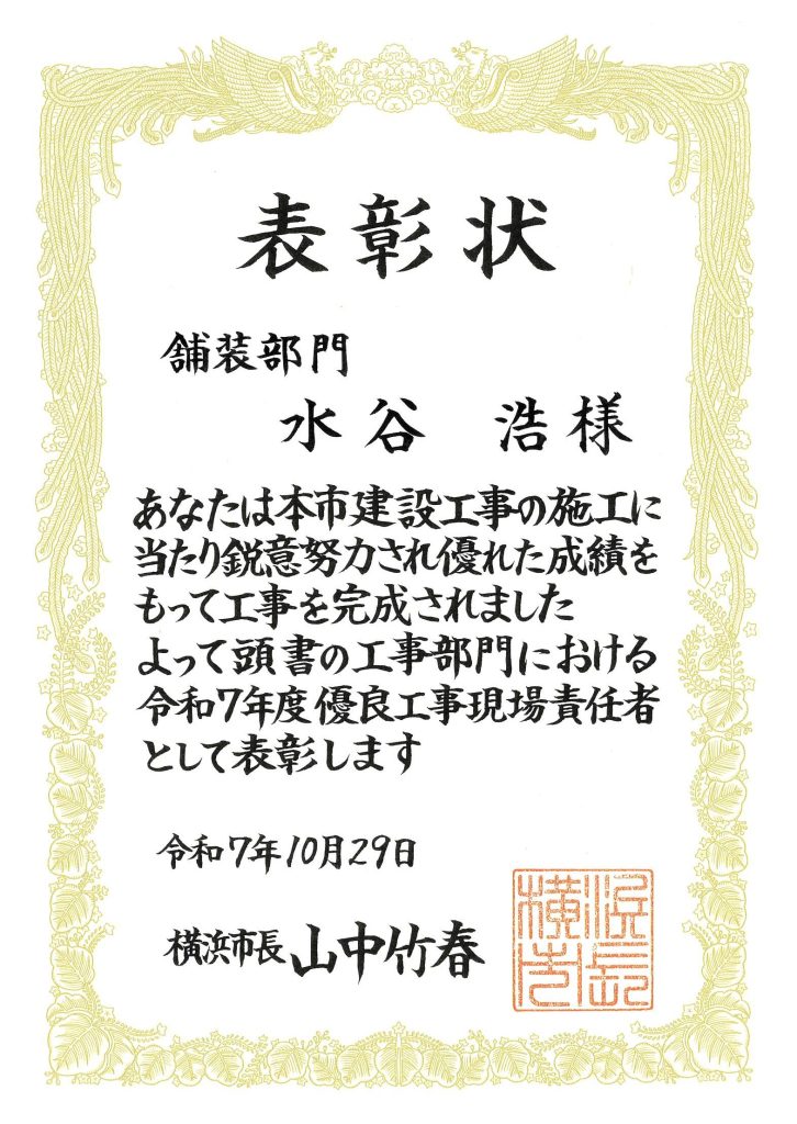 横浜市では、本市が発注した工事のうち、特に優れた施工を行った現場責任者を市長が表彰しており、現場における技術力・品質管理・安全管理などが総合的に評価されます。